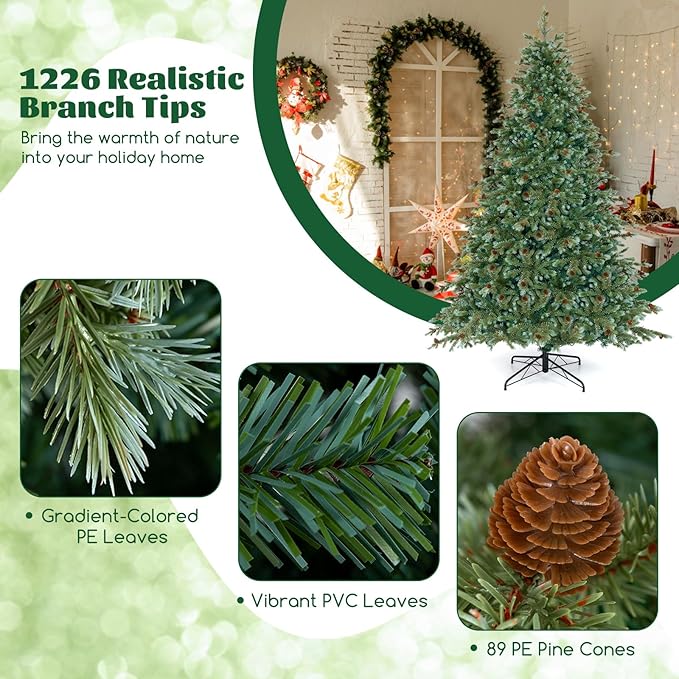 - Great Vibrancy: The 8 ft Xmas tree boasts a stunning array of 89 PE pine cones and 1226 realistic branch tips, artfully combining gradient-colored PE leaves for a touch of whimsy with vibrant PVC leaves for a natural look, creating a holiday masterpiece.