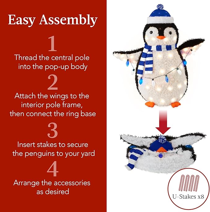 - 150 LED LIGHTS: A set of environmentally friendly, pre-strung fairy lights illuminate the penguin's interior while they hold an extra string light to add a splash of color