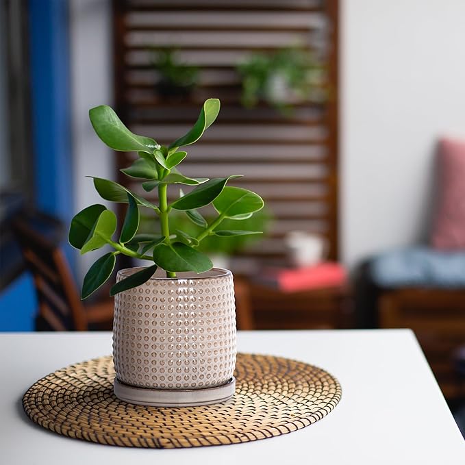 D'vine Dev Set of 2 Ceramic Plants Pots, 4 Inch Beaded Stoneware Flower Pot for Plants with Drainage Hole and Saucer, Light Brown, 27-E-Z-4