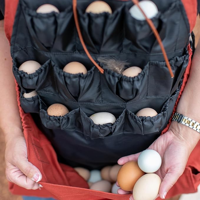 - COLLECT AND PROTECT YOUR EGGS: The Roo-ster apron features 12 individual pockets designed specifically to hold eggs securely. Each pocket has an elastic band at the top to prevent eggs from falling out, letting you move freely while keeping your eggs safe.