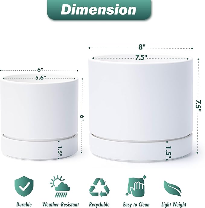- Two Size Set: Includes a 6-inch pot (6" diameter, 6" height) and a 8-inch pot (8" diameter, 8" height). Ideal for a variety of small to medium plants. Please refer to the dimension image for exact measurements.