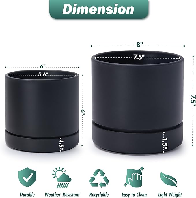- Two Size Set: Includes a 6-inch pot (6" diameter, 6" height) and a 8-inch pot (8" diameter, 8" height). Ideal for a variety of small to medium plants. Please refer to the dimension image for exact measurements.