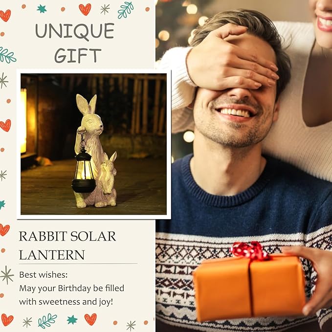 - Rabbit with Solar Lantern Outdoor Statues : The cute handmade rabbit decor symbolizes good luck, joy, and prosperity, adding warmth and elegance to any space. Enjoy beautifully illuminated solar garden decorations outdoor lights with no need for cords or frequent maintenance—it's good for the environment and your wallet.