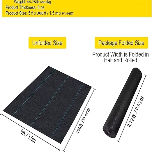 - High Strength & Durability: Garvee 5.0oz heavy duty landscape weed barrier fabric, made of tightly woven polypropylene fabric needle which punched with UV-stabilized. 98.7% opaque to light, Prevents weed seeds buried in the soil beneath from sprouting. The durable weed blocker fabric will highly increase your productivity and Economic benefits. Size: 5 x 300 ft / 1.52 x 91.4 m