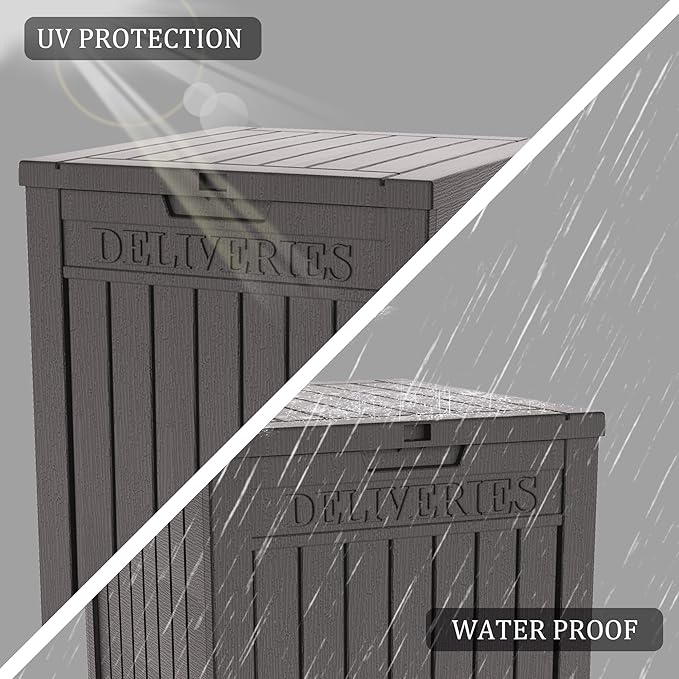- Weatherproof Resin for Year-Round Use. Durable, waterproof resin, this deck box resists rain, sun, and UV exposure. Ideal for all-season use, it won’t peel, rust, or warp like wooden or metal boxes—keeping your items protected outdoors.