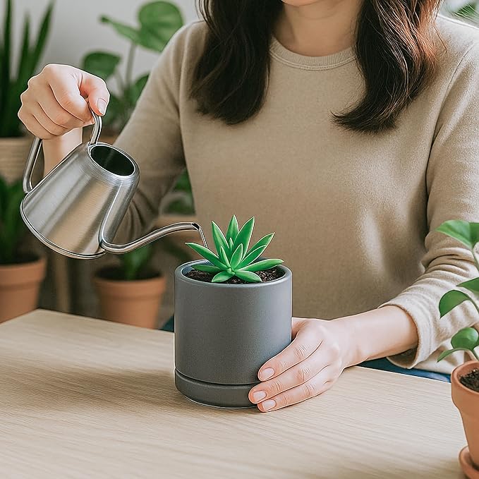 D'vine Dev 3.5 Inch Ceramic Planter Pot with Drainage Hole and Saucer, Indoor Cylinder Round Planter Pot, Speckled Grey, 94-O-A-3
