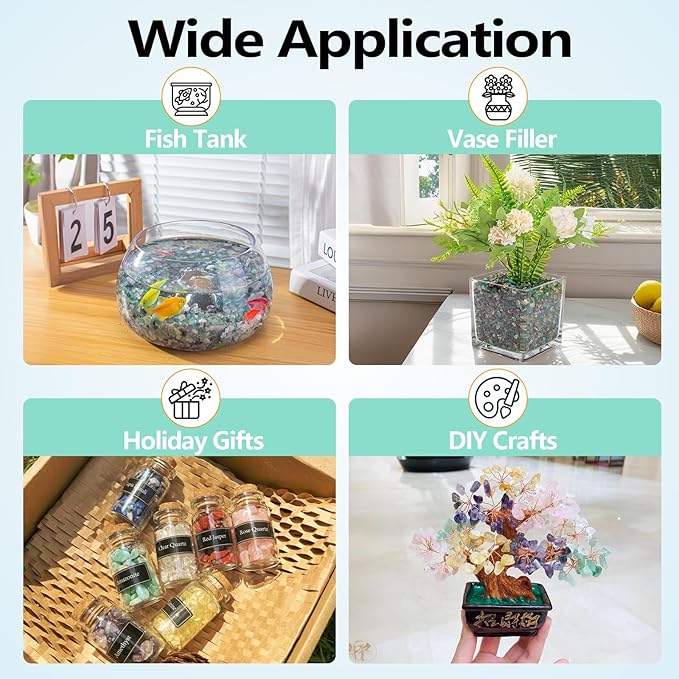 - Feature: Green crushed crystal is 5-7mm (0.2"-0.27"), 0.88 Lb/Box. Green agate chips are made from high-quality natural blue agate crystals, carefully processed into irregular shapes to create a unique and eye-catching look. (Please clean agate before use to bring out the dazzling color of the stone)