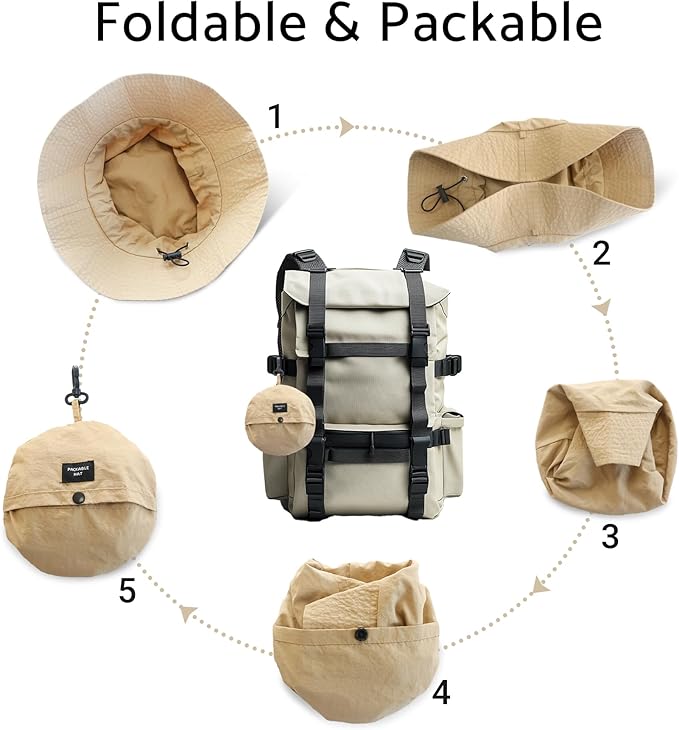 - FOLDABLE & PACKABLE: When you have no need to put your sun bucket hat on , you can easily have it folded into a small round bag and selectively hang it up or tuck it away in your backpack, handbag, or pocket with ease