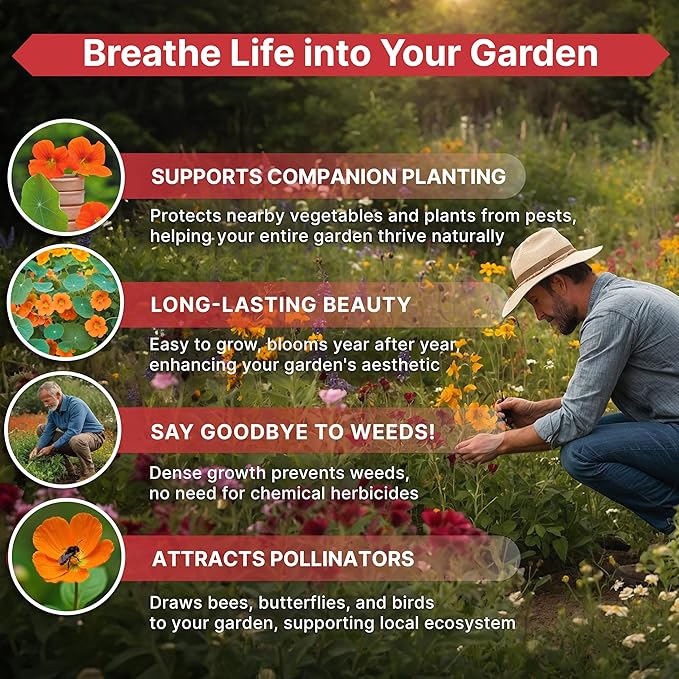- High Germination Rate - Grow beautiful nasturtium flowers effortlessly, whether in indoor trays or your backyard garden. Our premium seeds boast a superior germination rate, rigorously tested to ensure successful growth year-round. Perfect for creating vibrant blooms in your own garden, these top-quality seeds are also a thoughtful gift for gardening enthusiasts.