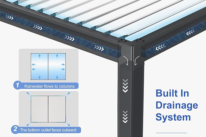 - Installation Tip: For optimal drainage, install the louvered pergola on a flat surface to prevent water accumulation