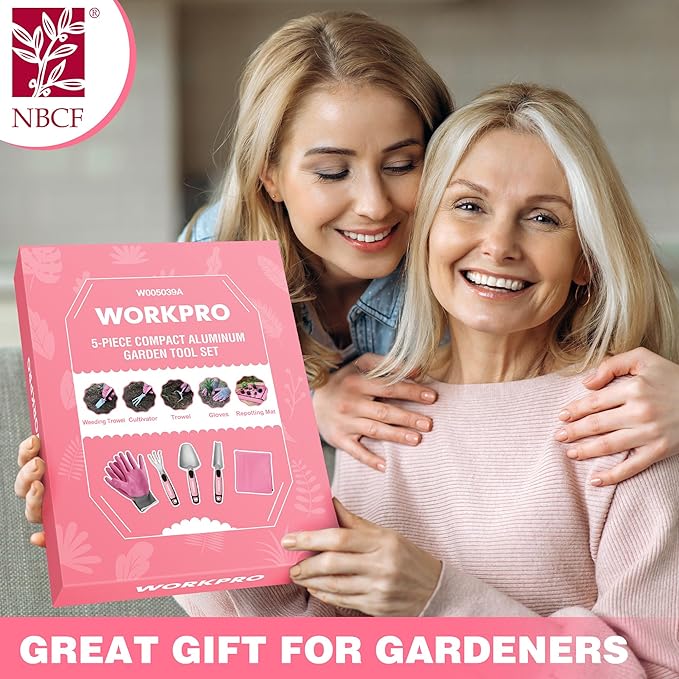 - 5PCS Pink Garden Tools Set: The WORKPRO Garden Tool Set includes a hand trowel, hand rake, weeding trowel, waterproof plant transplanting mat, and a pair of durable gardening gloves. Designed for planting, digging, loosening soil, and transplanting, this set meets all your gardening needs, bringing you a more comfortable and enjoyable gardening experience