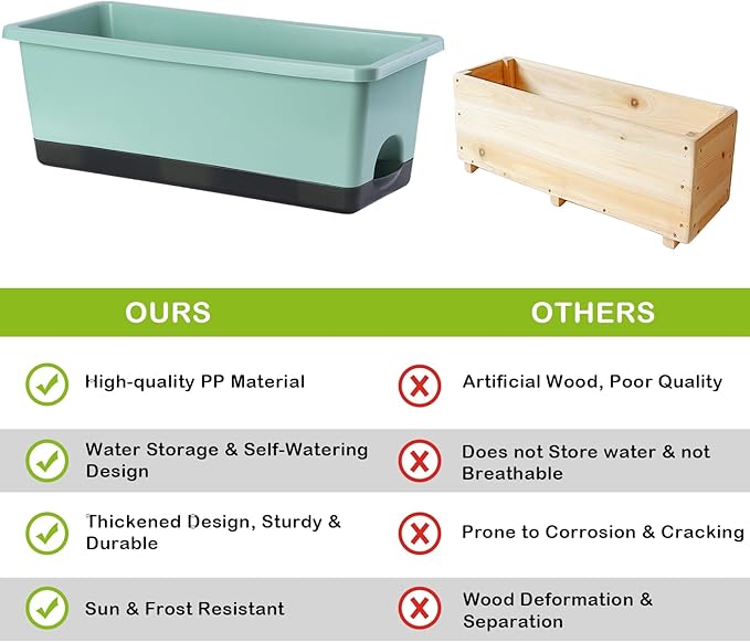 - 【Premium & Durable】The planter pots are made of high quality PP material and has been thickened to bear up to 300KG (660LB). This window box planter is sturdy, wear-resistant and durable. It can be exposed to light, wind, and sunlight for long periods of time, with a lifespan of decades. It is an excellent planter box for both indoor and outdoor.