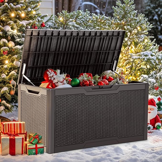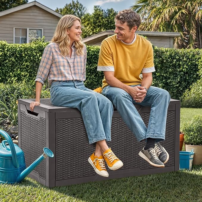 - Extra Seating: Doubling as a comfortable bench seat, this plastic deck box can support up to 485 pounds; Set it up in just 15-30 minutes, and enjoy its unique wood-grain texture that seamlessly blends with any patio or deck decor in no time