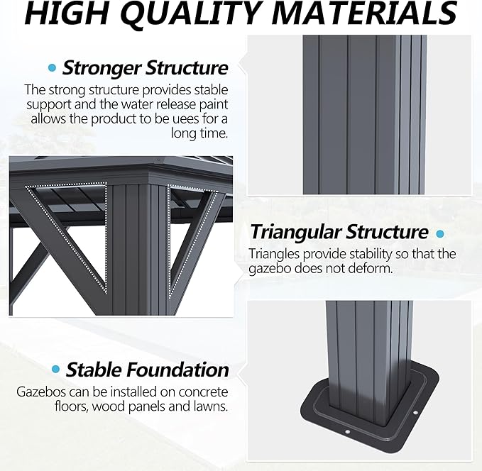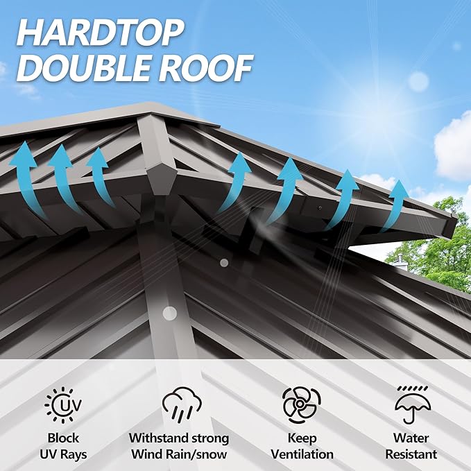 - 【Double-walled & Curtain and Netting】 - The hardtop gazebo features fully enclosed double-sided zippers, double trail system and double-walled sidewalls. Curtains and nets protect you from insects, sunlight and rain while maintaining full airflow and visibility. Polyester fabric and mesh ensure good ventilation and open views; Protect you from rain and UV rays while adding more privacy. Provide a safe and comfortable environment for your family and children.