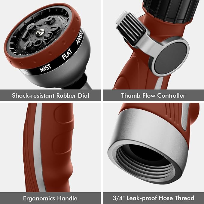 - 【Thumb Control Hose Sprayer】Simply and effortlessly spray water with the thumb flow control. Adds more convenience when you switch the watering between on & off, or high & low pressure. The anti-slip rubber is built in the metal flow controller, which can provide hassle-free thumb push and pull. A reliable & functional tool when you need to water your garden, lawn, grass, plants, and flower beds.