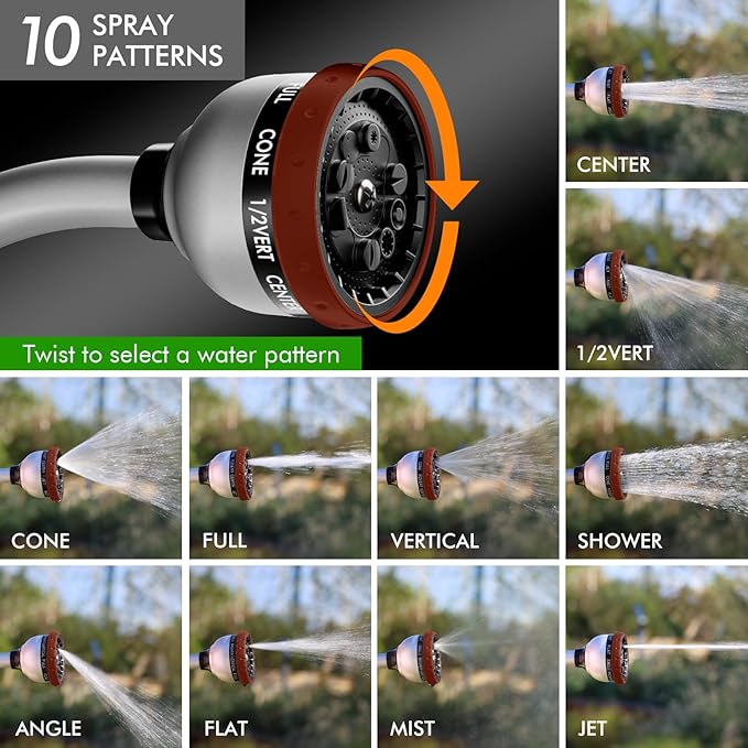 - 【10 Watering Patterns】Rotate the spray head dial to select a water pattern from Shower, Flat, Full, Mist, Jet, Center, Cone, Angle, Vertical, and ½ Vertical. Whether you need the high-pressure jet to clean your window, the useful angle to wash your car, the gentle shower to clean your shrubs, or the soft mist to water your hanging baskets, the 10 patterns have you all covered.