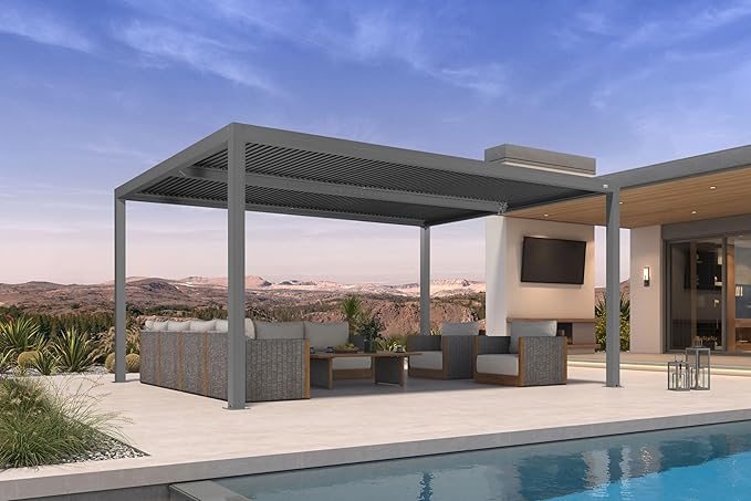 - High-Quality Finish: This louvered pergola features a premium, rust-resistant slate grey finish. The classic grey finish seamlessly complements any outdoor spaces.