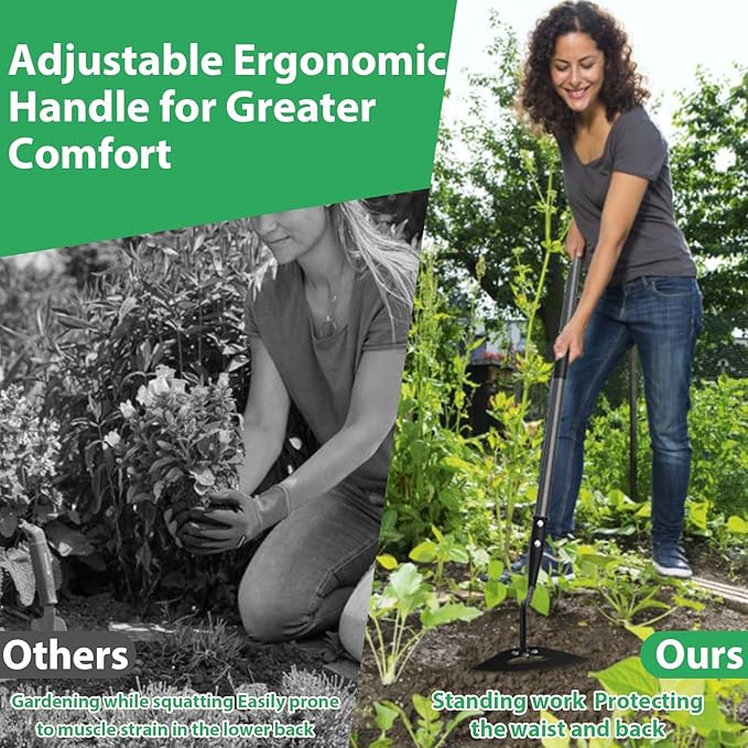 - Adjustable handle: The handle of the weeding hoe can be adjusted in length by adding or reducing the middle rod, with a maximum length of 56 inches, to adapt to various work scenarios. Whether squatting or standing, you can work easily and comfortably.