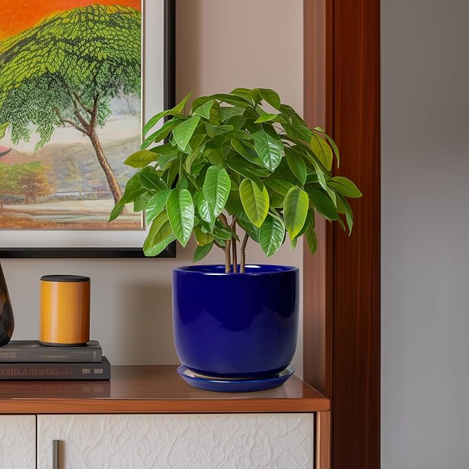 8 Inch Ceramic Plant Pot - Decorative Round Planter for Indoor Plants with Drainage Hole and Saucer, Home House Room Office Garden Decor, Blue