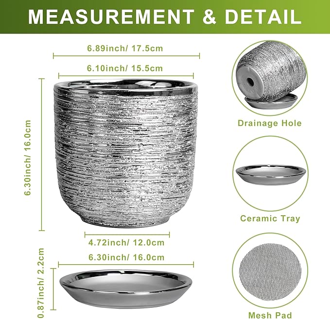 - Size of Silver Planter: Each 7 inch plant pot is 6.89” D x 6.57” H. A matching saucer to prevent leaks, allowing you to place plant pot anywhere with confidence