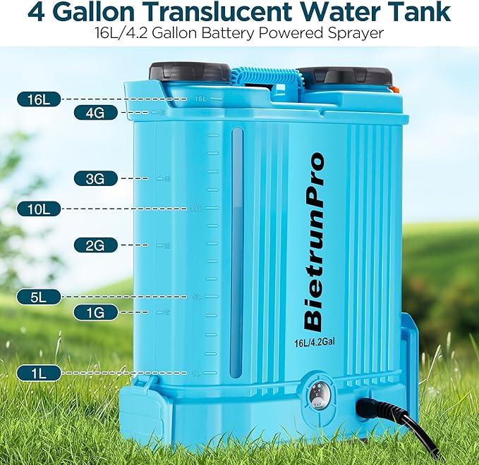 - 4-Gallon Tank: The large-capacity 4-gallon tank supports extended spraying tasks over larger areas. The tank features: A filter mes at the water inlet to prevent debris from clogging the sprayer. A water level indicator to monitor remaining liquid at a glance.