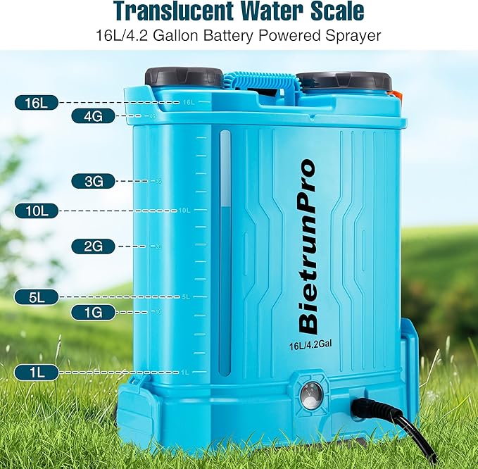 - 4-Gallon Tank: The large-capacity 4-gallon tank supports extended spraying tasks over larger areas. The tank features: A filter mes at the water inlet to prevent debris from clogging the sprayer. A water level indicator to monitor remaining liquid at a glance.