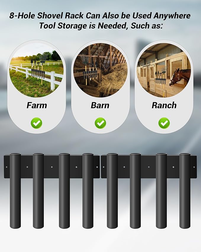 - Widely applicable: The 8-hole shovel rack is not only suitable for trucks, but also can be used in working environments such as farms, ranches, warehouses, and workshops, providing efficient tool storage and management solutions. Whether it is farmland work or warehouse sorting, it can help you optimize your workspace