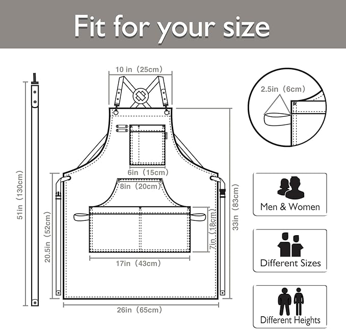 - Universal Size: The apron size is 25.5 inches x 32.5 inches, suitable for full coverage size. The ultra-long, quick-release strap can accommodate multiple sizes, up to men's XXL size (51 inches waist circumference)