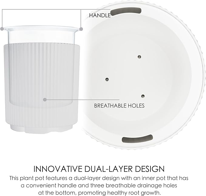 - Double-Layer Planter: Its innovative dual-layer design that offers both enhanced durability and superior drainage. The upper planting layer ensures optimal soil aeration with built-in drainage holes, while the lower catchment tray prevents waterlogging and protects surfaces.
