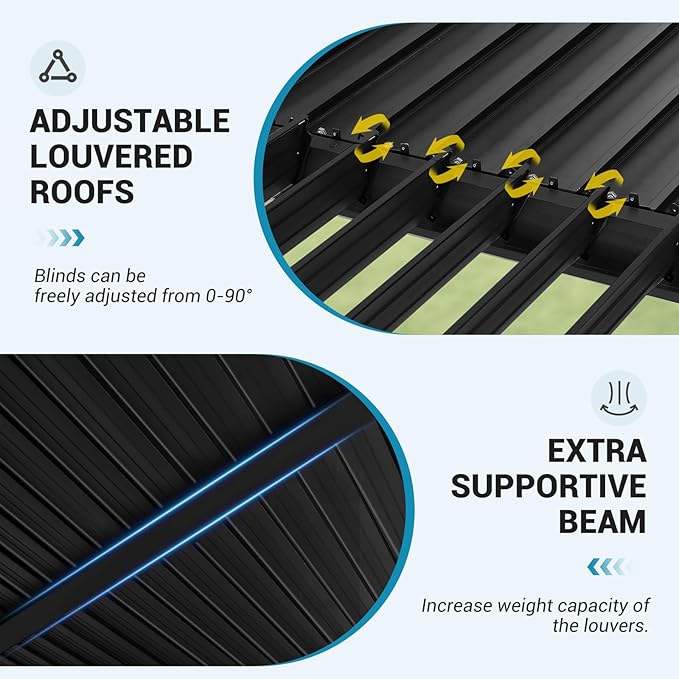 - 【Adjustable Roof】Enjoy complete control over your outdoor environment with our outdoor pergola featuring independent adjustable roofs that can tilt from 0° to 90°. This unique design allows you to easily manage sunlight and shade, creating the perfect ambiance while also offering shelter from rain when fully closed.