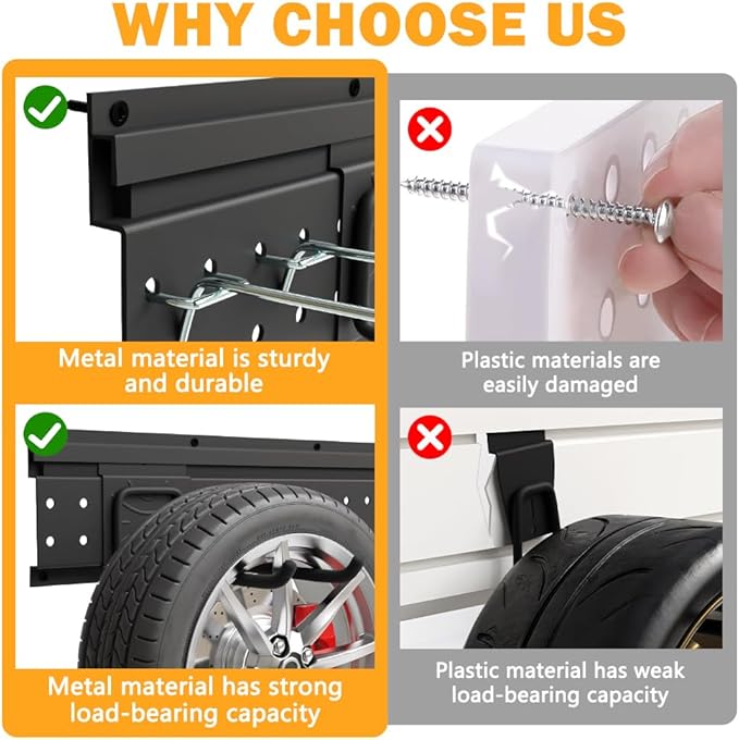 - Customize Like a Pro: The combination design of slatwall and pegboard can meet the suspension of various tools. Comes with 6 slatwall hooks, 10 pegboard hooks and 3 tracks.