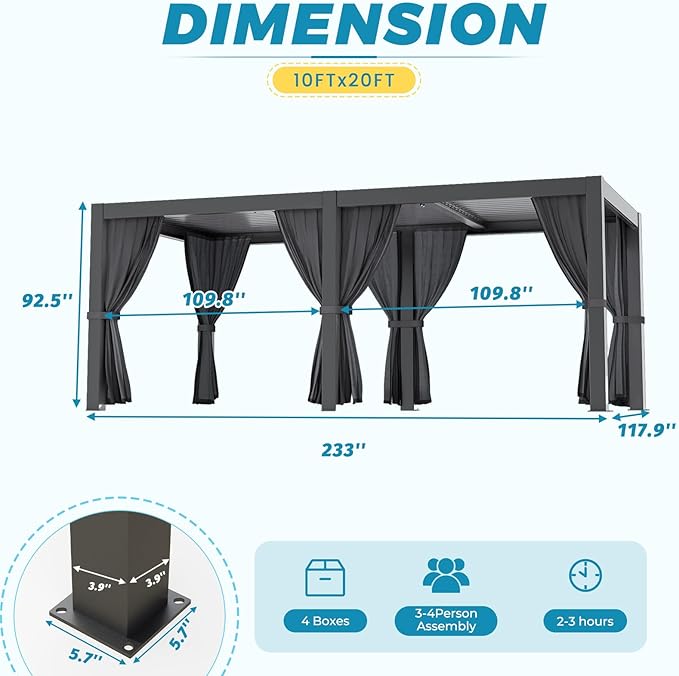 - 【Stable & Easy to Install】 Designed for stability, our pergola withstands winds of up to 50mph. The robust aluminum frame and sturdy base make installation straightforward—following the manual, you can have your new pergolas for patios set up in just 2-3 hours with a team of 3-4 people.