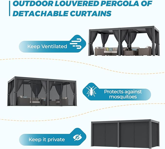 - 【Durable Aluminum Pergola】Our louvered pergola is expertly crafted from powder-coated aluminum, ensuring a sturdy and rust-resistant design that stands up to the elements. This aluminum pergola will enhance your outdoor space while providing long-lasting durability for your patio, backyard, garden, or deck.