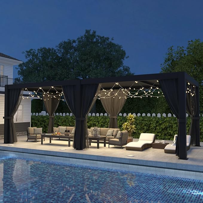 LVUYOYO Outdoor Louvered Pergola 10' x 20', Aluminum Pergola with Adjustable Roof, Waterproof Metal Gazebo with Curtains and Netting for Patio, Backyard, Garden, Deck (Black)