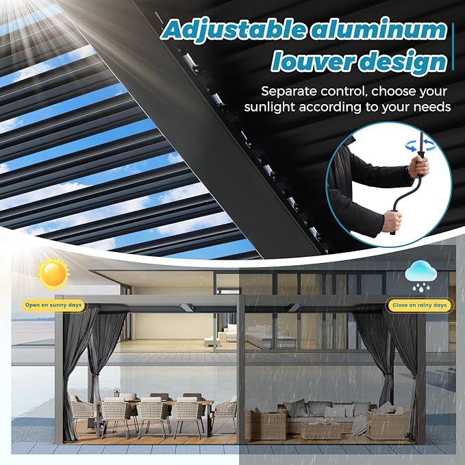 - 【Adjustable Roof】Enjoy complete control over your outdoor environment with our outdoor pergola featuring independent adjustable roofs that can tilt from 0° to 90°. This unique design allows you to easily manage sunlight and shade, creating the perfect ambiance while also offering shelter from rain when fully closed.
