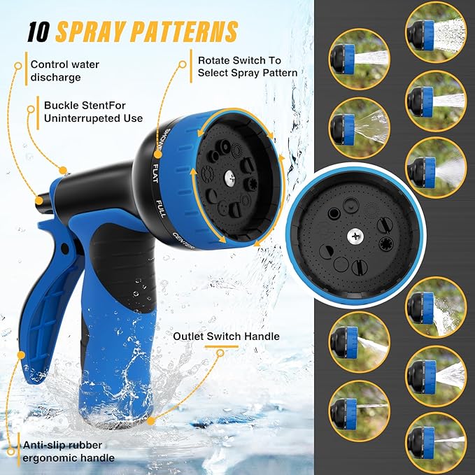 - 【10 Patterns of Spray Nozzle】- Comes with a multi-function nozzle that provides 10 different watering modes, ranging from a gentle mist for delicate flowers to a powerful jet for cleaning hard surfaces. This allows you to easily meet all your watering needs, whether it's for watering the garden, washing the car, or flushing the patio. 100 ft length, being the most popular size option, can easily cover your entire yard, offering great convenience for all your outdoor and indoor watering and cleaning needs.