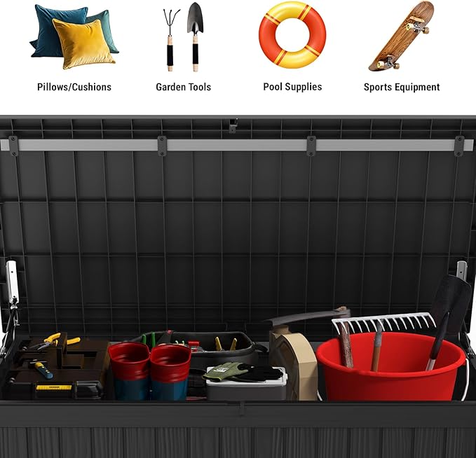 - 【Smooth & Secure Design】- Equipped with dual hydraulic hinges, the lid opens smoothly and stays securely in place for hassle-free access to your items, the slow-close mechanism ensuring safety for your families, lockable lid (lock not included) provides added security for your outdoor essentials