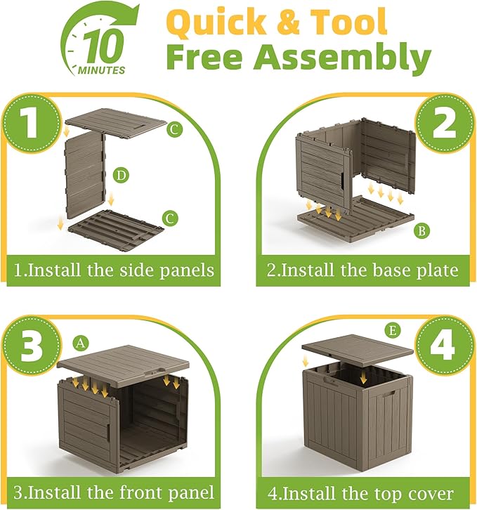 - QUICK AND TOOL-FREE ASSEMBLY: Setting up this outdoor storage box is hassle-free and takes under 10 minutes. With its snap-together panel design, you'll have a reliable storage solution in no time.