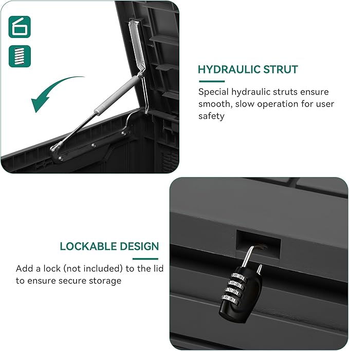 - Versatile and Secure: Our resin storage box is designed for both indoor or outdoor use, suitable for storing patio furniture cushions, gardening tools, pool accessories, and more; The deck box with lock design ensures your items stay safe and secure(Locks not included)