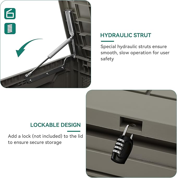 - User-Friendly Design: This outdoor deck boxes are equipped with hydraulic struts for smooth and safe operation, as well as dual built-in side handles, making it easy to move around as needed