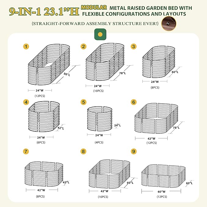 - 9-IN-1 MODULAR PLANTER BOX- This garden bed comes with 4 corner panels and 8 side panels for 9-in-1 modular kit, which allows you to modularize it with flexible configurations and layouts, making the most of your garden space. There are 9 or more different combination options for you to DIY your own garden bed.