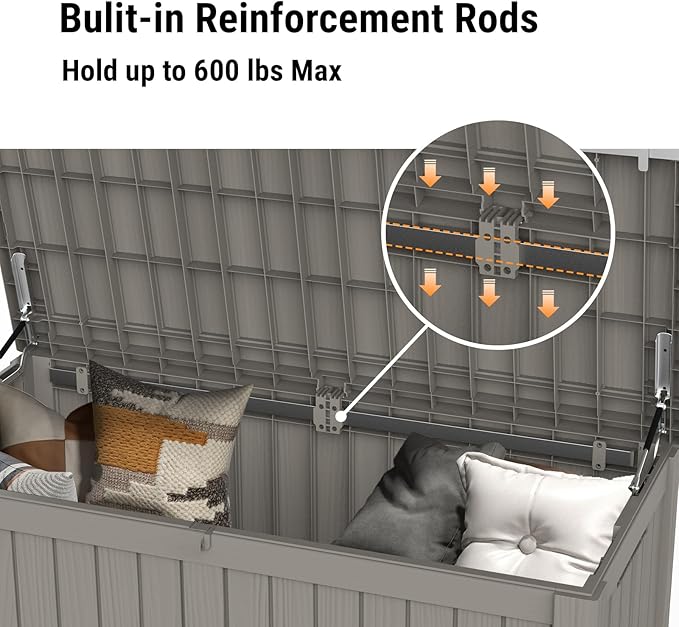 - 【Sturdy & Reinforced Structure】- Built for stability and strength, this deck box incorporates metal reinforcement rods boosting its structural integrity by 30%, not only prevents deformation but also allows the lid to support a remarkable weight capacity of up to 600 lbs, making it suitable for use as an additional bench or seating option