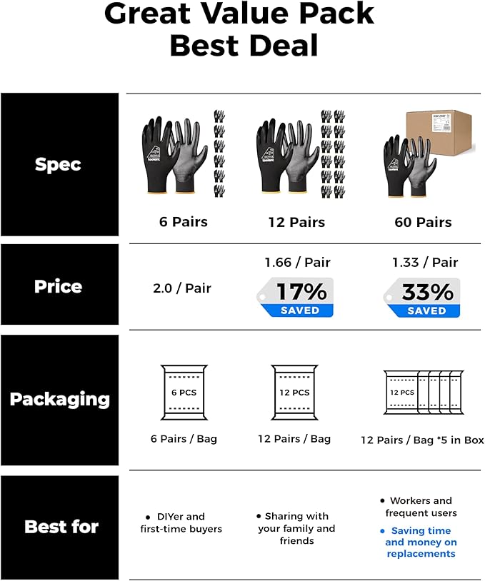 - Multi-pack Work Gloves: Includes various colors for different jobs. Dark coatings hide dirt and extend wear, while grey is for light-duty tasks. Ideal for auto repair, warehouse work, mechanics, cleaners, construction, gardening, woodworking, painting, and home projects.