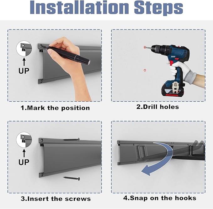 - Flexible and Adjustable Storage: Includes 4 tracks, allowing you to easily position hooks to create a customized setup that suits your specific storage needs