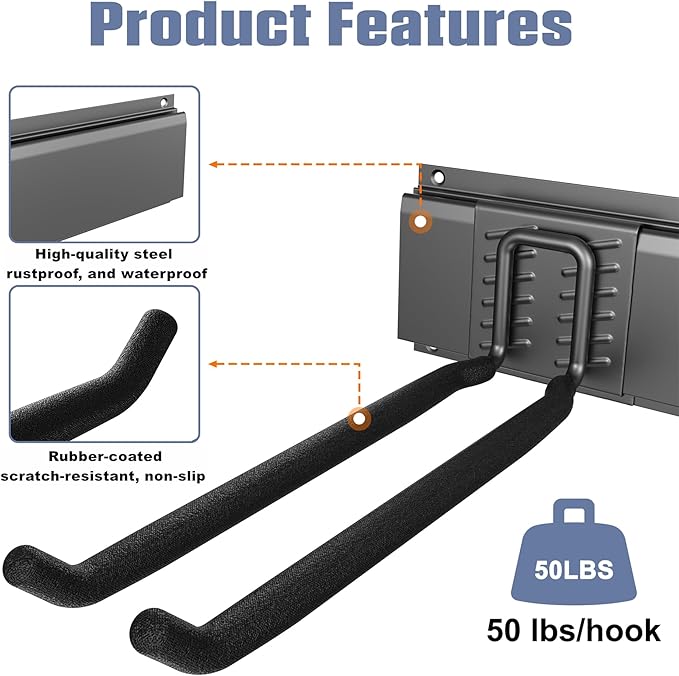 - 8 Heavy-Duty Double-Prong Hooks: Each 11-inch hook holds 3-5 tools or 4-5 folding chairs, providing efficient storage for various items. Designed for secure and accessible organization