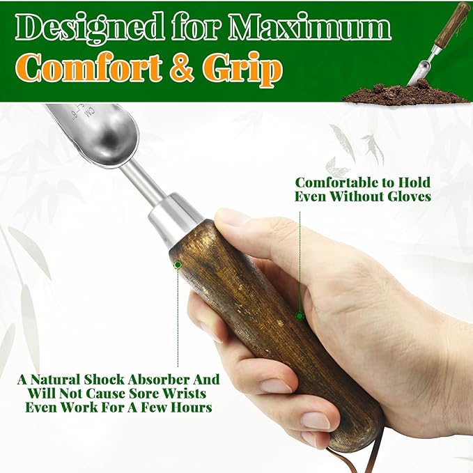- Comfortable Wood Handle with Secure Grip: The smooth wooden handle fits comfortably in your hand, reducing fatigue during long gardening sessions. A hanging hole allows for easy storage.