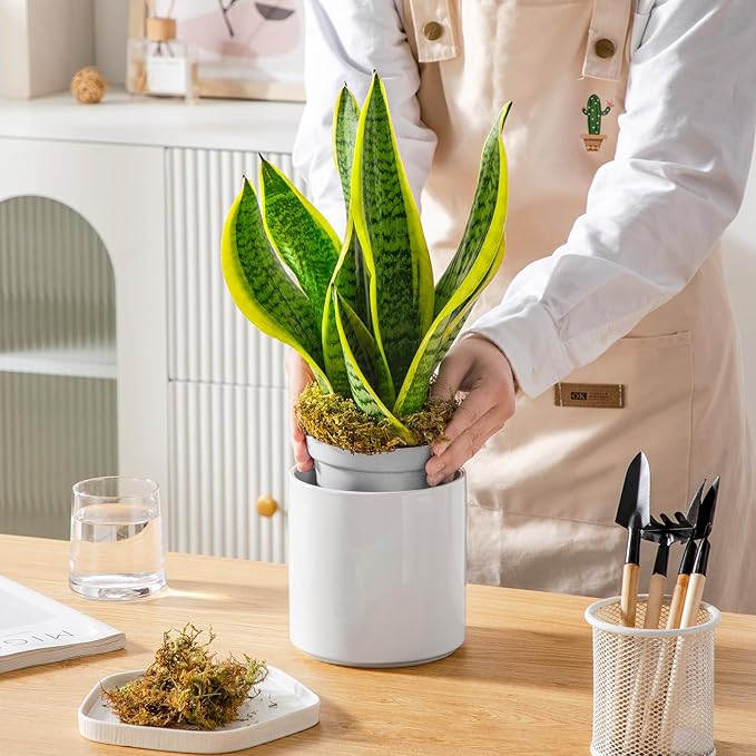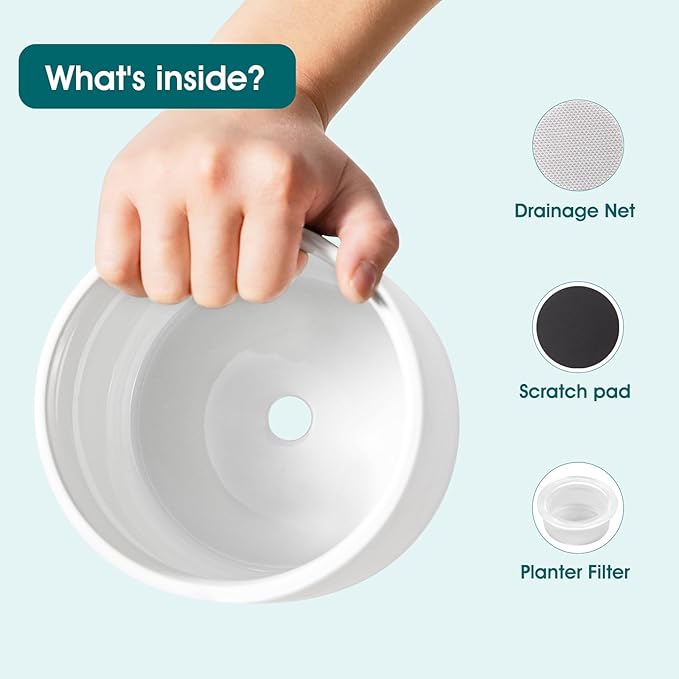 - 【Smart Drainage System】 Central bottom drainage hole + 3 essential accessories for hassle-free care: Mesh Filter prevents soil leakage and keeps surfaces clean. Anti-Scratch Pads protect tables and floors from scratches. Silicone Drain Plug lets you control water flow—no messy spills! Switch between drainage and water storage modes with ease.