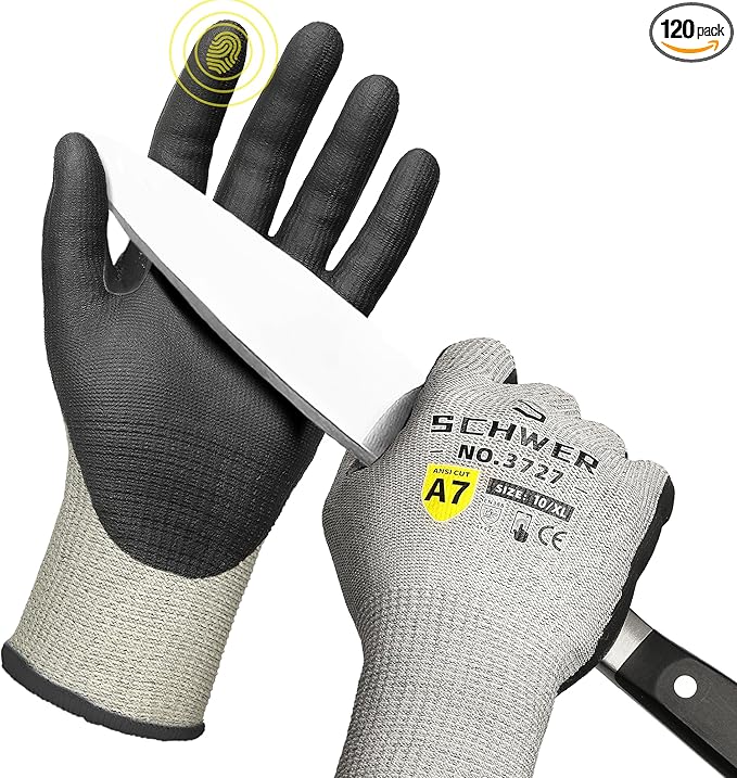 120 Pairs High Level Cut Resistant Work Gloves for High Risk Work, ANSI A7 Cutting Gloves with Reinforced Thumb, Used for WoodWorking, Construction, Non Slip, Durable, Breathable & Cool, XL, PR3727