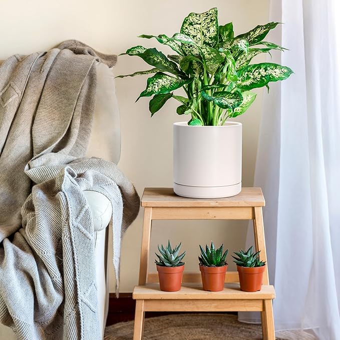 - Simple, elegant, and modern cylindrical straight round planter pot with saucer and drainage hole.