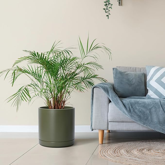 D'vine Dev 12 Inch Ceramic Planter Pot with Drainage Hole and Saucer, Indoor Cylinder Round Planter Pot, Olive, 94-O-F-J